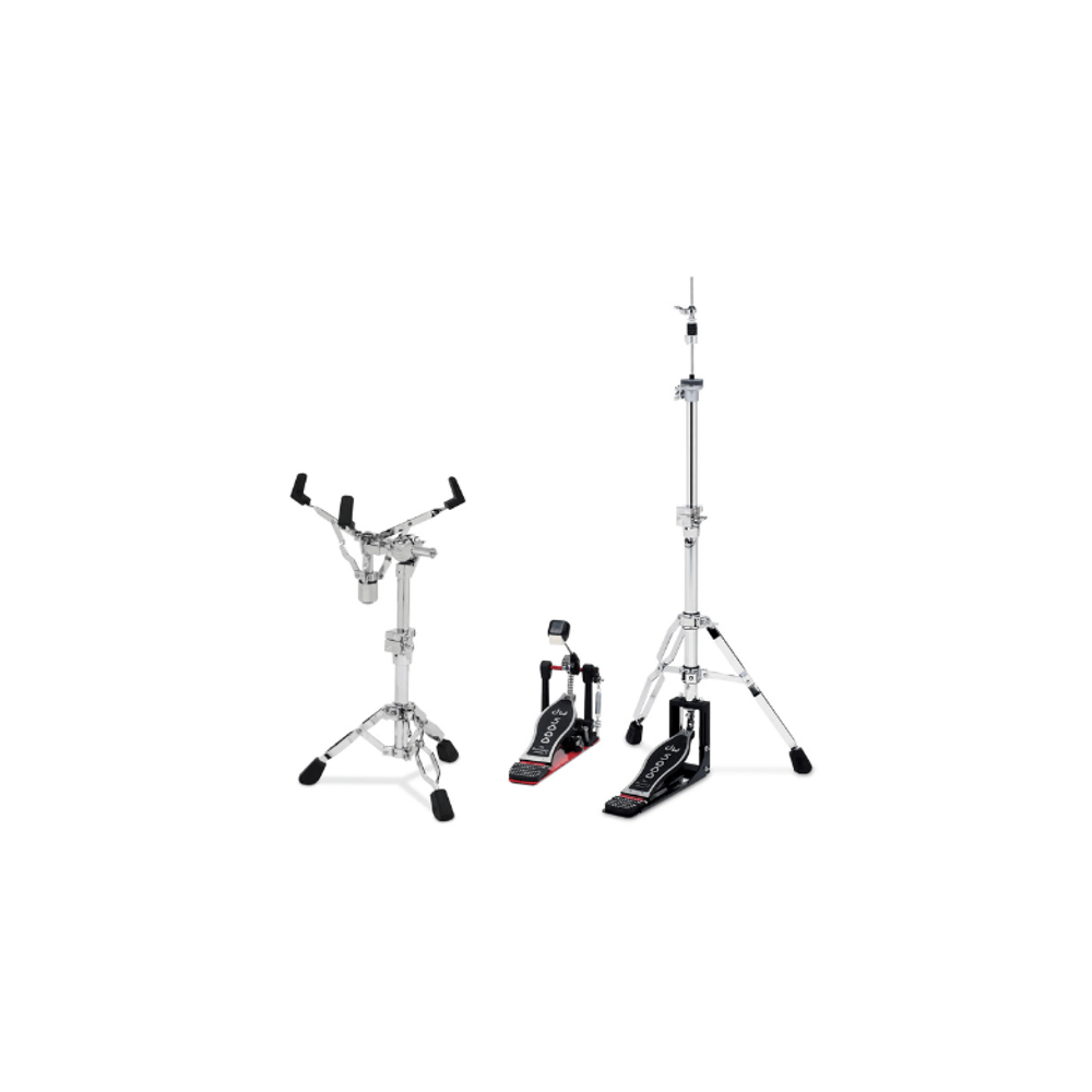 montagem inspiradora com o pedal de bumbo, a máquina de chimbal e a estante de caixa,